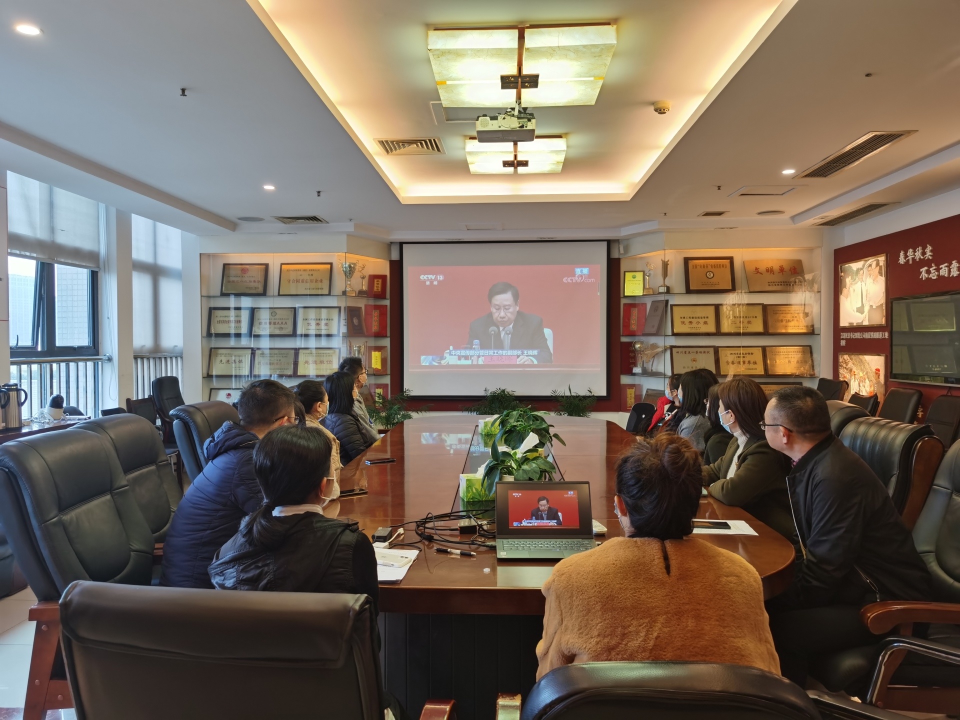 为确保广大党员职工能够及时收看本次新闻发布会,集团采取了各项措施:一是积极组织,通过微信群、QQ群发送观看通知,并要求各党支部、各部门(机构)认真做好组织工作;二是响应上级防疫要求,除会议室集中观看外,还组织各职能部门、二级公司在办公地点自行通过电脑、手机观看,保障集团职工生命健康。集团各职能部门、二级公司、项目部约100余人收看本次新闻发布会。