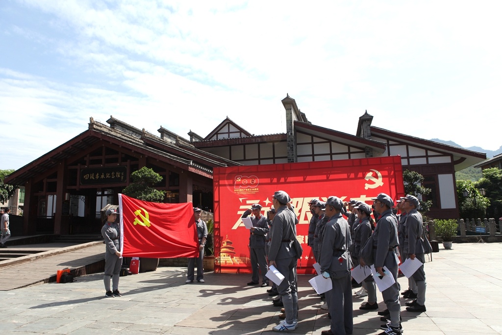 在四渡赤水土城渡口浮雕前,全体党员整齐有序地站好队伍,身着红军服、头戴八角帽,在党委书记、董事长柯军领誓下,逐字逐句重温入党誓词,回忆当年自己入党时那难以忘怀的神圣时刻。宣誓完毕后,大家高唱《没有共产党就没有新中国》《歌唱祖国》《四渡赤水出奇兵》等红歌,体验当年革命者血与火般艰苦的战斗生活,感怀红军战士的革命情怀。