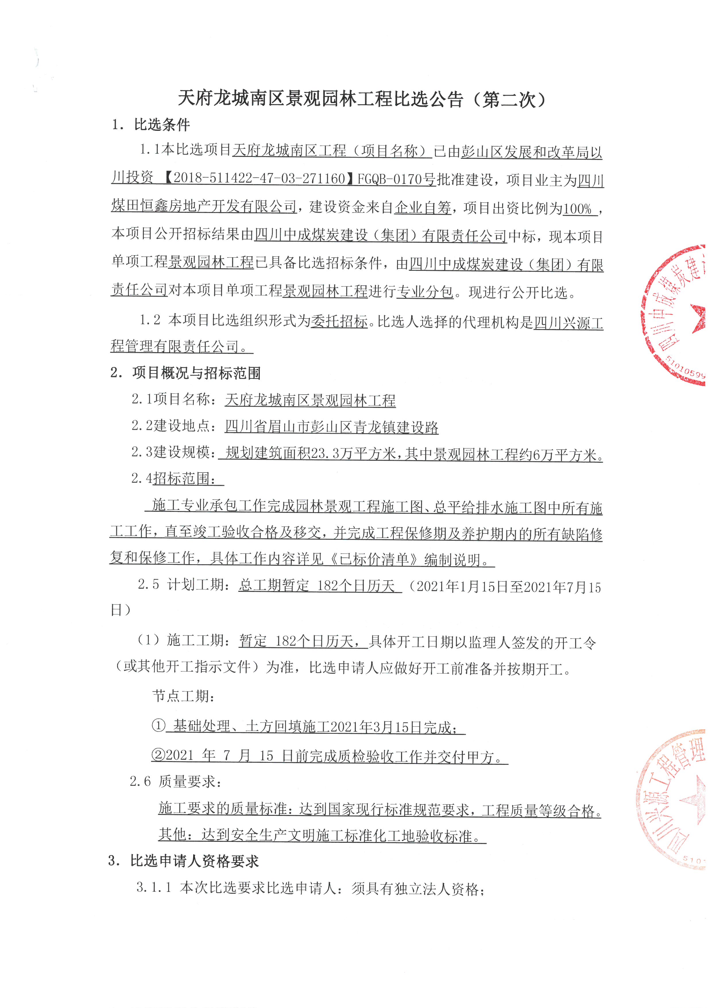 天府龙城南区景观园林工程比选公告(第二次)