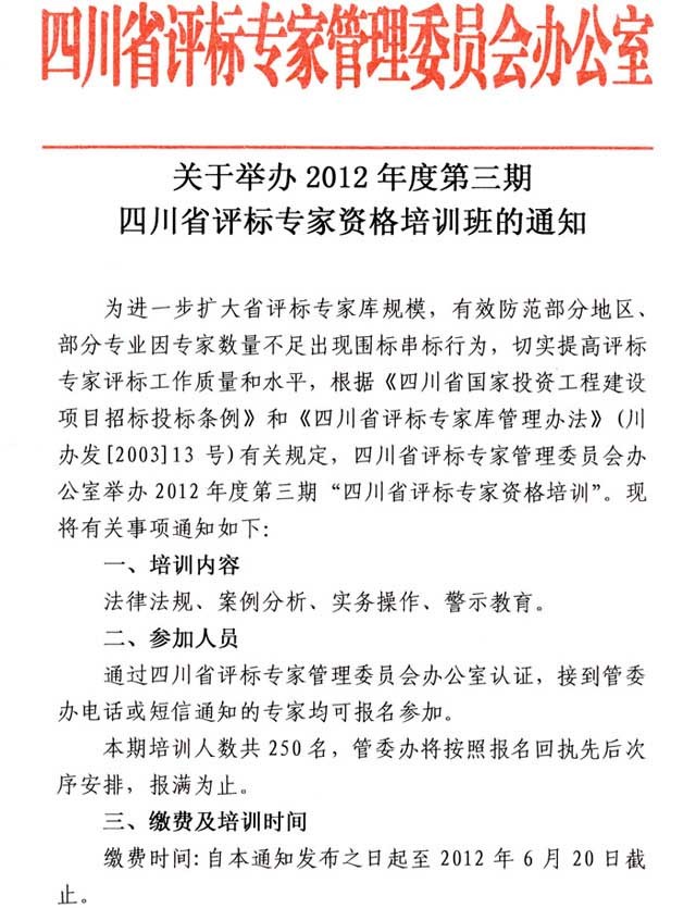 关于举办2012年度第三期四川省评标专家资格培训班的通知