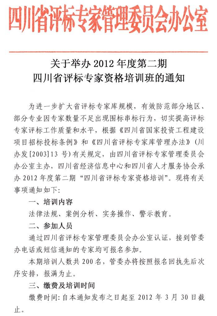 关于举办2012年度第二期四川省评标专家资格培训班的通知